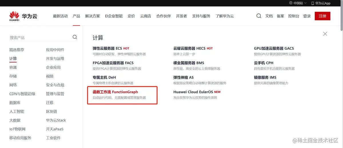 登录华为云后,按“产品”-“计算”-“函数工作流FunctionGraph”路径,进入华为云函数工作流FunctionGraph平台首页。