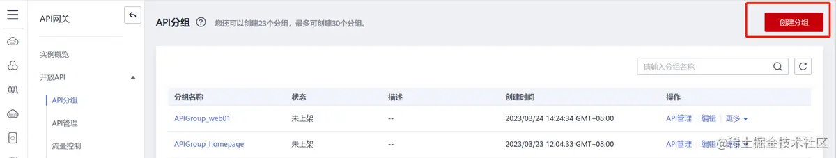 点击“创建分组”,在API网关页创建分组