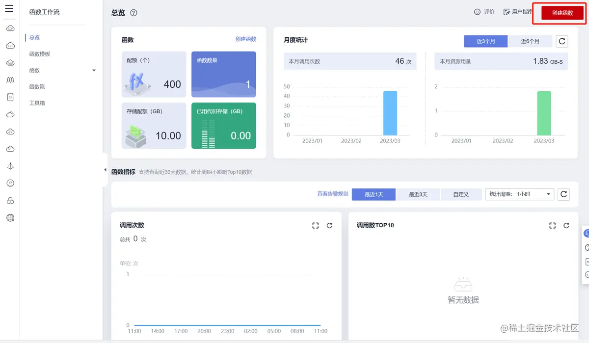 将区域切换至“广州”,点击“创建函数”按钮。