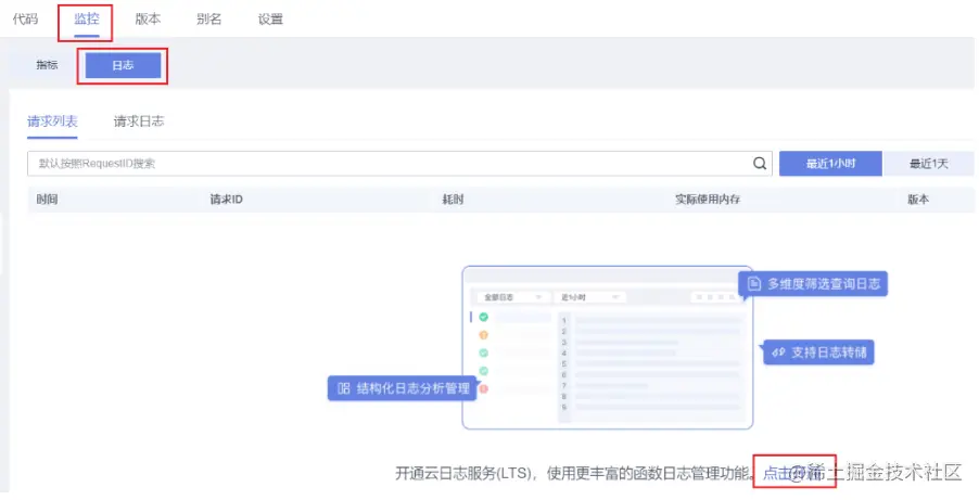 为更好的观测函数的调用结果,先开通FunctionGraph日志上传LTS服务在函数详情页面,依次点击“监控”-“日志”,点击“开通”。