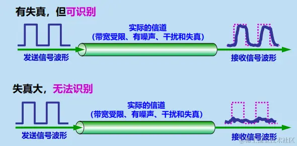 l 码元传输的速率越高,或信号传输的距离越远,或噪声干扰越大,或传输媒体质量越差,在接收端的波形的失真就越严重。