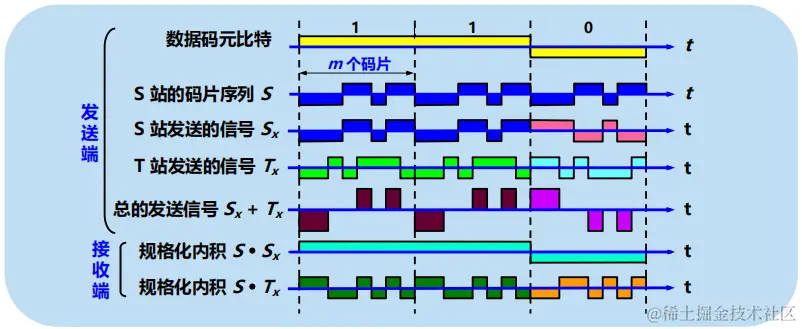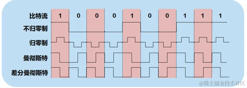 l 差分曼彻斯特编码:在每一位的中心处始终都有跳变。位开始边界有跳变代表 0,而位开始边界没有跳变代表 1。