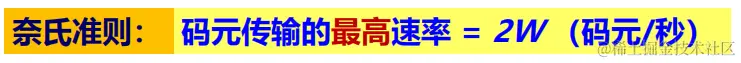 在带宽为 W (Hz) 的低通信道中,若不考虑噪声影响,则码元传输的最高速率是 2W (码元/秒)。传输速率超过此上限,就会出现严重的码间串扰的问题,使接收端对码元的判决(即识别)成为不可能。
