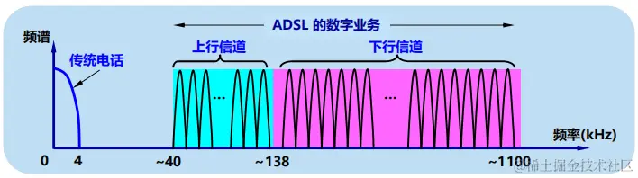 ADSL 技术把 0~4 kHz 低端频谱留给传统电话使用,而把原来没有被利用的高端频谱留给用户上网使用。