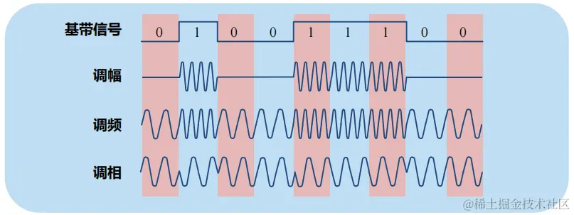 带通调制:使用载波 (carrier)进行调制,把基带信号的频率范围搬移到较高的频段,并转换为模拟信号。经过载波调制后的信号称为带通信号(即仅在一段频率范围内能够通过信道)。