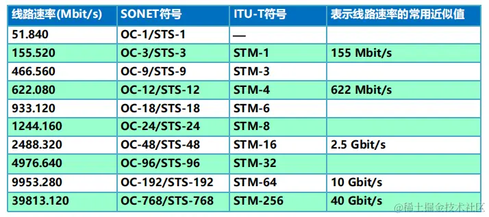 与 SONET 的主要不同:SDH 的基本速率为 155.52 Mbit/s,称为第 1 级同步传递模块 (Synchronous Transfer Module),即STM-1,相当于 SONET 体系中的 OC-3 速率。