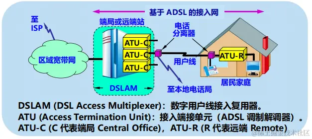 数字用户线接入复用器 DSLAM(DSL Access Multiplexer),用户线和用户家中的一些设施。