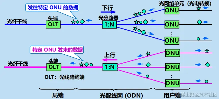 光配线网 ODN (Optical Distribution Network):位于光纤干线和广大用户之间。