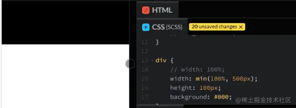 对于一个响应式的项目,肯定不希望它的宽度会一直变大,而是当达到一定的阈值时,宽度从相对单位变成了绝对单位,这种情况就适用于 min(),简单改造下代码: