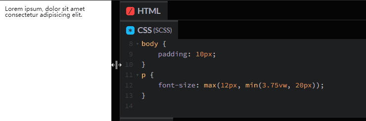 通过 max()、min() 的配合使用,以及搭配一个相对单位 vw,成功地给字体设置了上下限,而在这个上下限之间实现了动态变化。