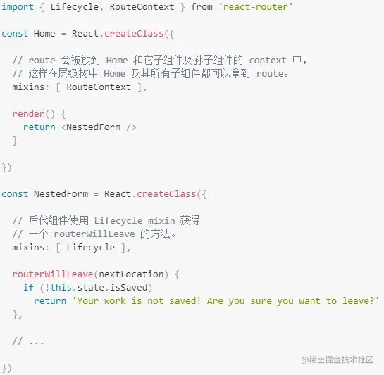 - 若在深层嵌套的组件中使用routerWillLeave钩子,需要在route组件中引入RouteContext,并用mixin安装