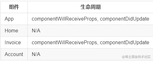 - App 从 router 中接收到新的 props(例如 children、params、location 等数据), 所以 App 触发了 componentWillReceiveProps 和 componentDidUpdate 两个生命周期方法
