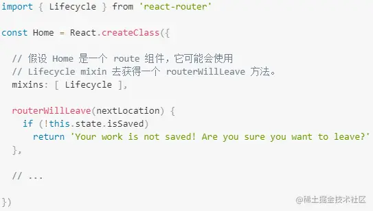 routerWillLeave生命周期钩子可以使React组件拦截正在发生的跳转或在离开route前提示用户。