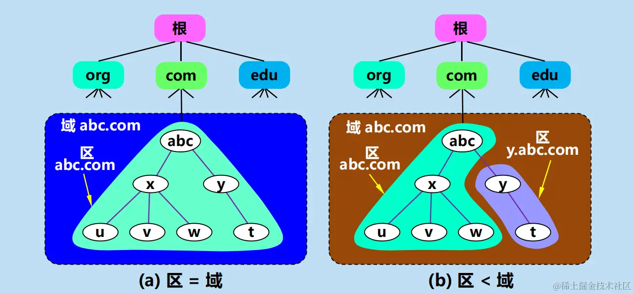 一个服务器所负责管辖的(或有权限的)范围叫做区 (zone)。
