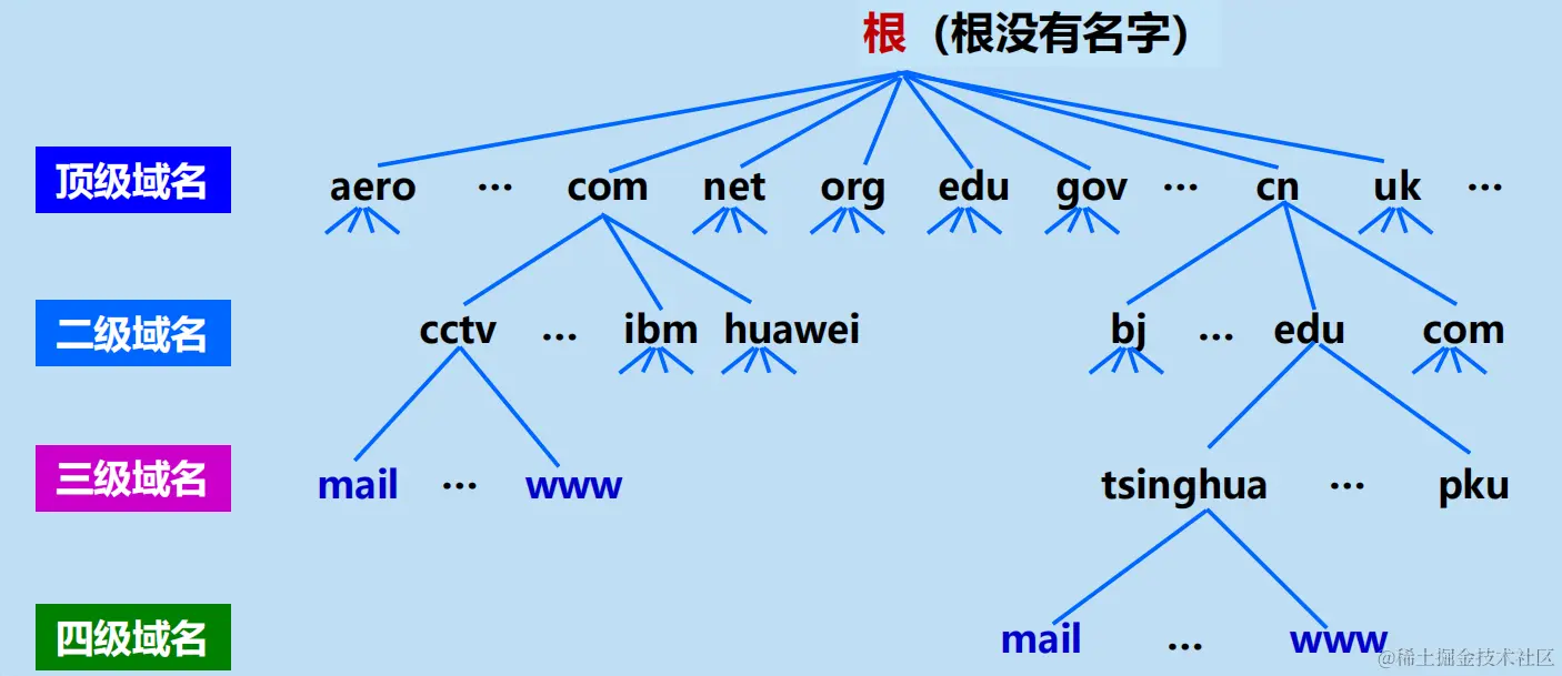 注意:互联网的名字空间是按照机构的组织来划分的,与物理的网络无关,与 IP 地址中的“子网”也没有关系。