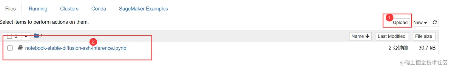 我们点击打开Jupyter页面,进入对应实例,选择右侧upload,上传Notebook代码,代码下载链接: