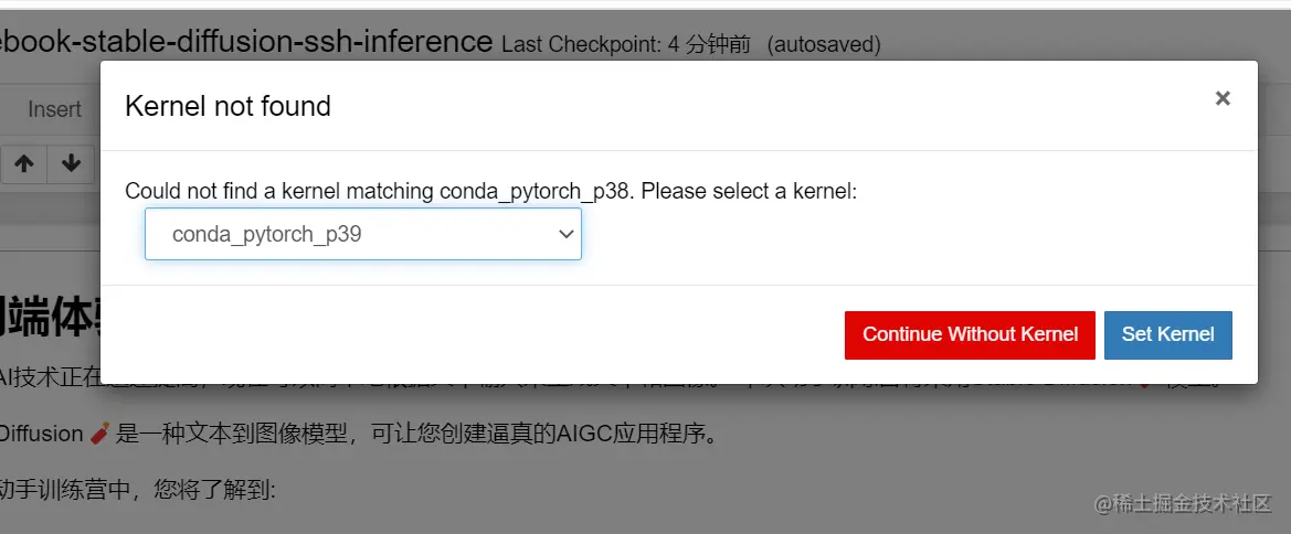 在第一次进入时,系统会自动跳出提示,让你选择对应kernel,我们选择conda_pytorch_p39核,并点击set kernel