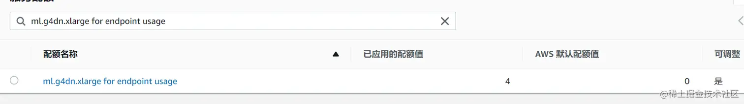 点击链接ap-northeast-1.console.aws.amazon.com/servicequot…进入配额列表,搜索:ml.g4dn.xlarge for endpoint usage,点击请求申请增加配额。
