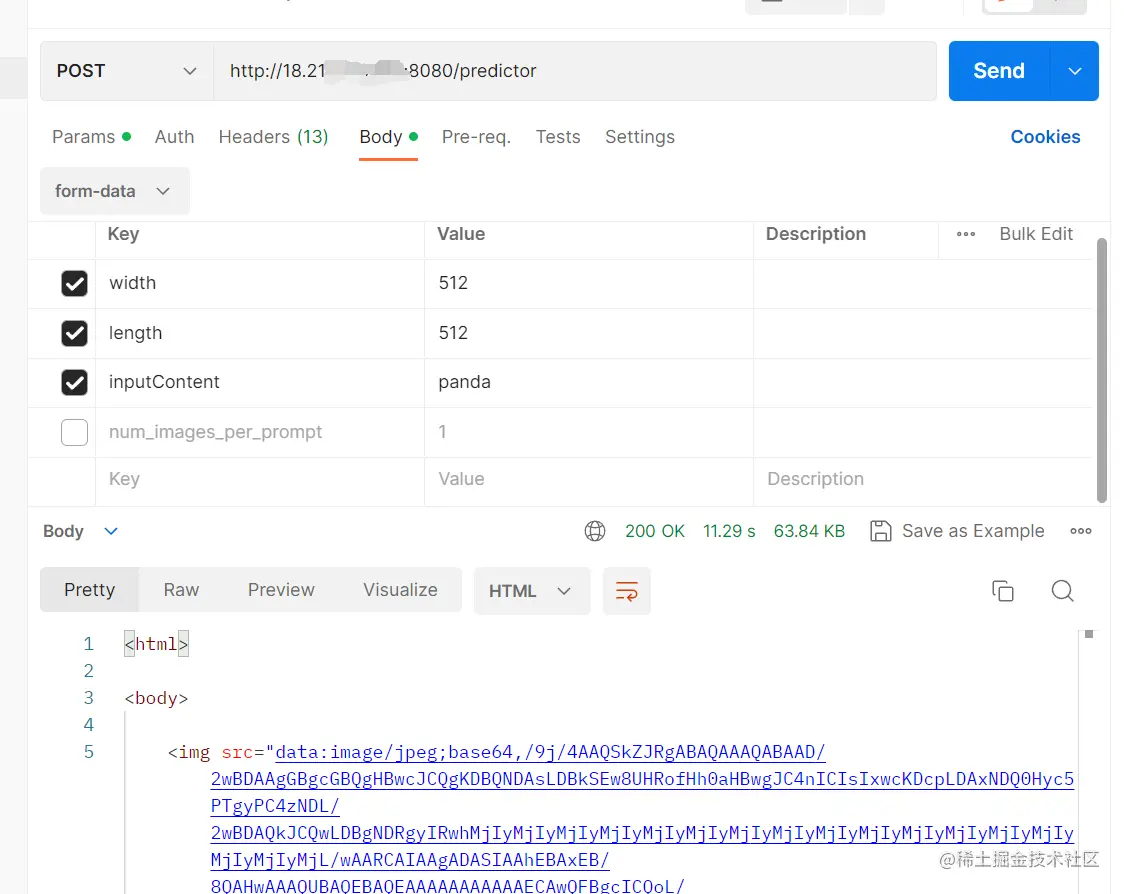 打开8080端口后,可以用Postman测试一下,在body里面,加入form-data,并输入对应的key和value,点击send发送,显示200,下方栏返回html且img当中有值,则配置成功: