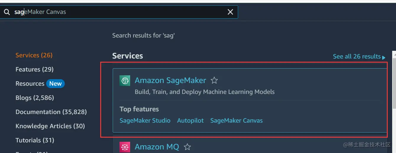 1、首先打开亚马逊云控制台,在查找服务处搜索关键词SageMaker,进入Amazon SageMaker环境: