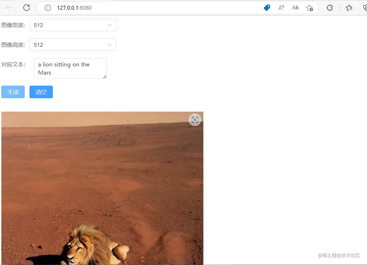 左侧可以看到后台为前端提供了8080端口,右侧前端页面提供了简单的demo,width和length代表输出图像的长宽,prompt为输入的文本,同样测试A cute panda is sitting on the sofa这条语句,成功输出: