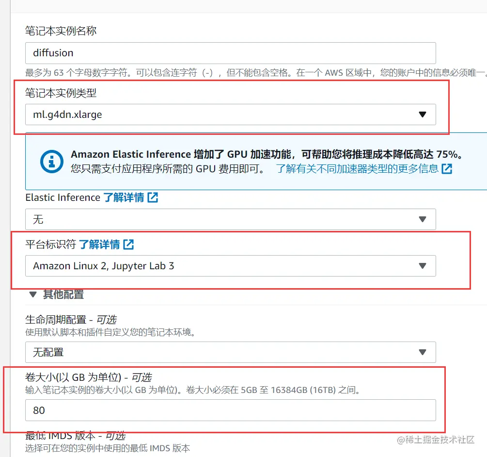 2、在左侧找到笔记本,点击笔记本--笔记本实例--创建笔记本实例,进入以下选项,笔记本实例类型是需要申请的资源类型,可以看到Amazon SageMaker给我们提供了很多类型资源,我们选择加速型g4dn.xlarge,在平台上我们选择熟悉的Linux和Jupyter,卷大小也就是存储空间,可以随意选择但不宜小于20GB。