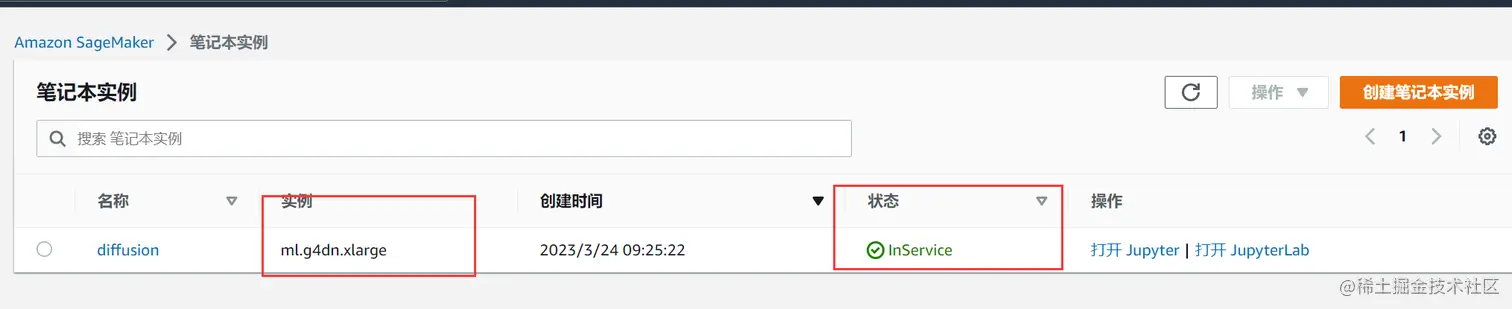 3、创建好后,我们在列表中就可以看到对应实例了,跟我们在其他云服务器中使用差不多,Amazon SageMaker也给我们提供了熟悉的Jupyter notebook。