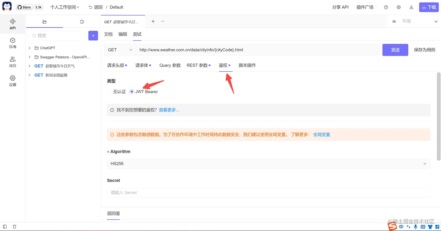 安装插件后,测试页面选中鉴权,填入数据后会自动在请求信息中添加头部 Authorization。