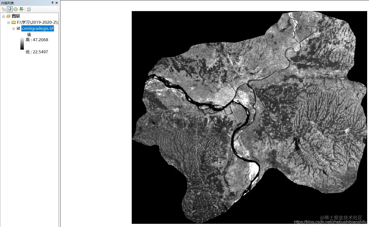 导入AcrMap 10.2软件中的图像为像元像素由22.3997至47.0569,若不对其重新划分温度区间处理,将会导致所成彩色图像各个颜色十分离散,不利于观察、分析。