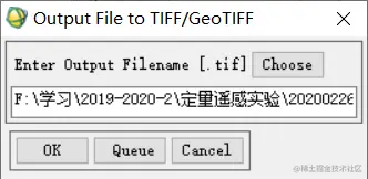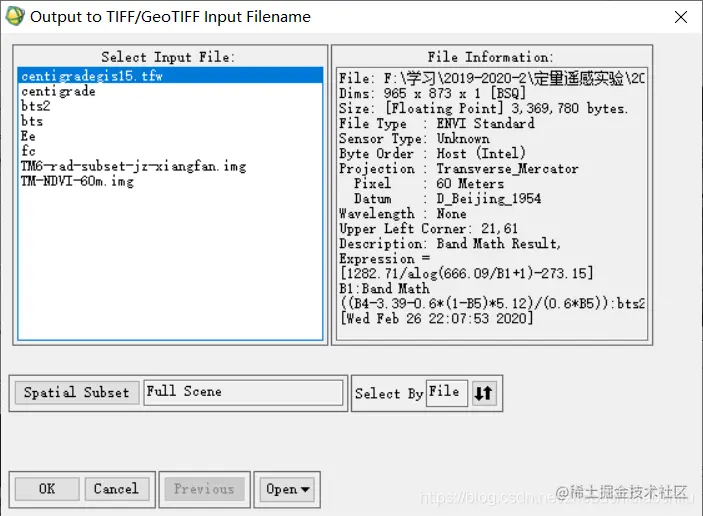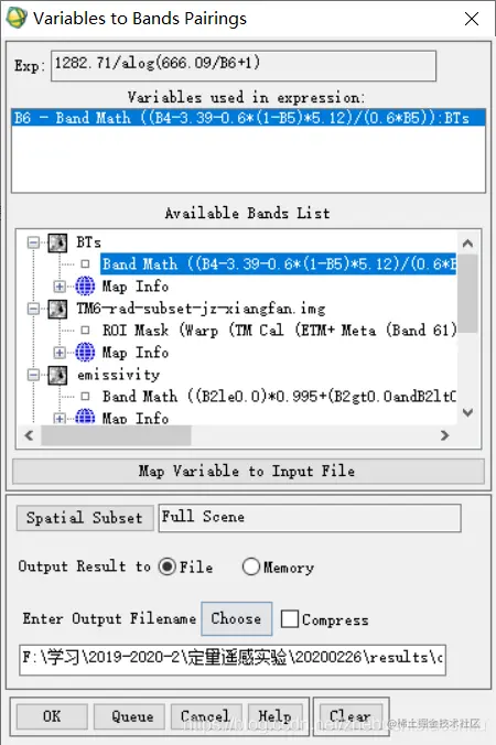 (2) 保存公式完成后,点击左下角“OK”按钮,即可开始公式的计算。在弹出的公式变量文件选择窗口中,将这一公式的变量“B6”选择为我们刚刚计算获得的黑体热红外波段辐射亮度结果图像文件,随后,配置输出文件地址等信息。