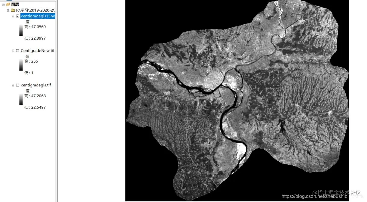 (7) 最终导入图像及其信息如下图所示。其中,有两个结果相近的图层是因为在一开始地表实际温度转换过程中,我减去的数值为“273”而并非“273.15”。
