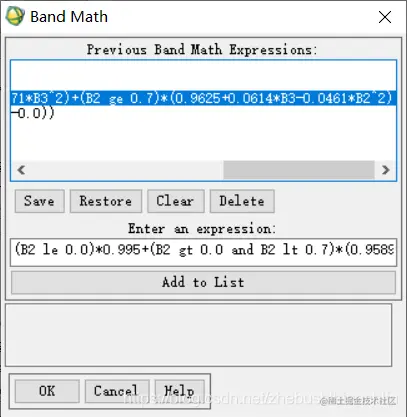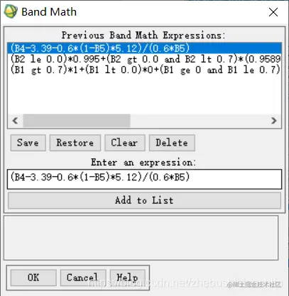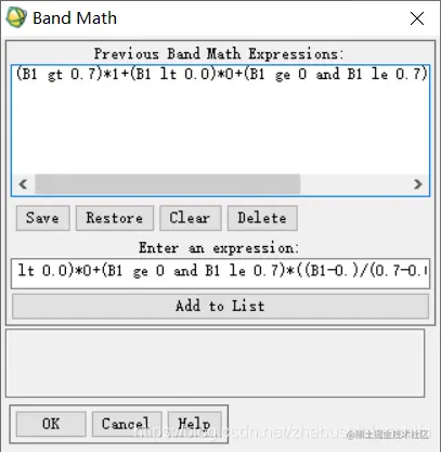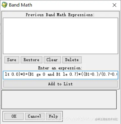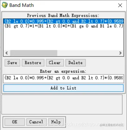 (2) 选择“Basic Tools”→“Band Math”,在弹出的公式创建窗口中输入本次实验的第一个公式,即植被覆盖度公式。输入公式完成后,点击下方“Add to List”按钮,即可将公式存入待选择区内。为了减少后期不必要的工作量,可以每次编辑完成一个公式后点击“Save”按钮,以将待选择区内的公式保存。