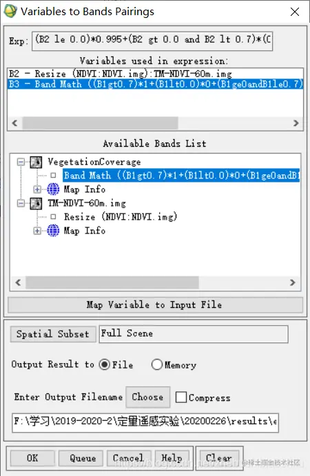 (3) 保存公式完成后,点击左下角“OK”按钮,即可开始公式的计算。在弹出的公式变量文件选择窗口中,将这一公式的变量“B1”选择为我们刚刚添加的文件“TM-NDVI-60m.img”。随后,配置输出文件地址等信息。