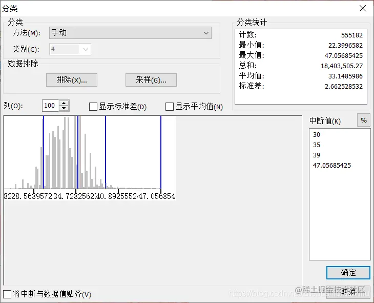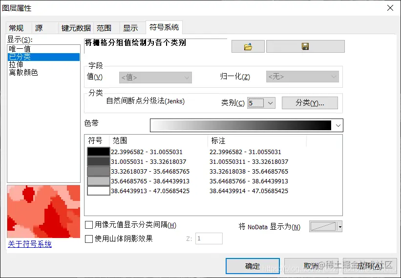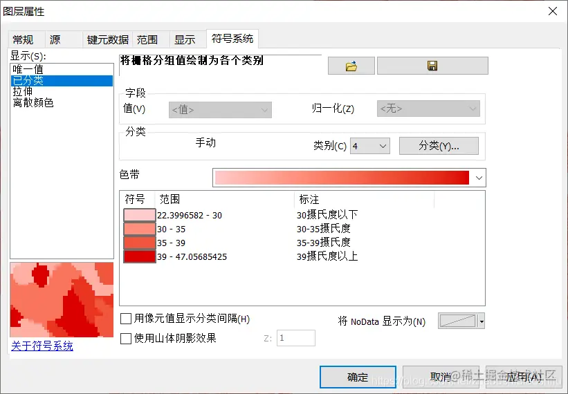 (4) 在图层名称处右键,选择“属性”→“符号系统”→“已分类”,打开“分类”按钮,将分类方法选择为“手动”,并依据要求设置四个“中断值”——30,35,39和图像像素的最大值47.0569。点击确定即可保存间断点设置。
