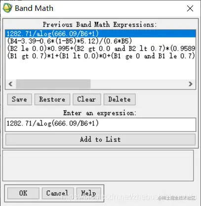 (1) 选择“Basic Tools”→“Band Math”,在弹出的公式创建窗口中输入本次实验的第四个公式,即地表真实温度公式。输入公式完成后,点击下方“Add to List”按钮,即可将公式存入待选择区内。为了减少后期不必要的工作量,可以在编辑完成这一公式后点击“Save”按钮,并将最近一次保存的公式文件覆盖,以将待选择区内的四条公式统一保存。
