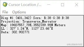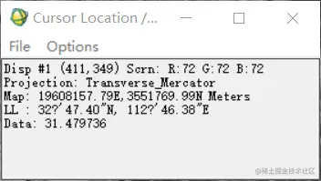 (4) 在得到的结果图像任意位置处右键,选择“Cursor Location/Value”或“Quick Stats”选项,均可以查看图像各个像元的像素信息。在这里,我使用“Cursor Location/Value”查看图像像元信息,得到如下所示的结果。