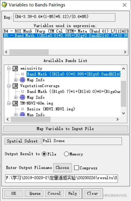 (3) 保存公式完成后,点击左下角“OK”按钮,即可开始公式的计算。在弹出的公式变量文件选择窗口中,将这一公式的变量“B4”选择为我们刚刚添加的图像文件“TM6-rad-subset-jz-xiangfan.img”,并将这一公式的变量“B5”选择为通过上述步骤获得的地表比辐射率结果图像文件。随后,配置输出文件地址等信息。