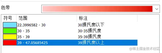(5) 回到图层属性窗口后,对四个范围所表示的内容加以标注,以方便后期制图。同时,针对温度专题图的特色,调节合适的配色方案。原本我准备使用红色系作为配色,但发现出图后整体区分效果并不是很好。因此选择另一种对比相对较强的配色方案。