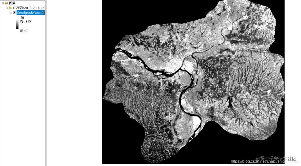 (4) 将第二次保存的“.tif”格式图像结果文件导入AcrMap 10.2软件中,看到结果数值为正常状态。