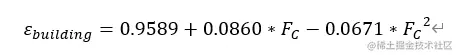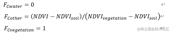 其中,F_C为植被覆盖度。由此可知,我们需要同时计算出地表植被覆盖度,用以确定地表比辐射率计算公式并参与计算。本文我们采取混合像元分解法求解植被覆盖度。同上述地表比辐射率计算公式较为一致,我们依然将地表分为水体、植被与建筑三个部分;其中,依据NDVI数值对这一类别加以具体区分。NDVI小于0时,认为地物为水体,植被覆盖度为0;NDVI大于0.7时,认为地物为植被,植被覆盖度为1;NDVI取值在[0,0.7]时,认为地物处于水体与植被之间,植被覆盖度依据公式计算。针对不同的地物,计算植被覆盖度: