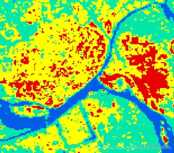如前所述,我们完成植被覆盖度的计算其实是为地表比辐射率计算做准备。同样是将地物分为水体、城镇与自然表面三个类别,依据经验法,运用与植被覆盖度形式类似的分段计算公式,为不同类别地物赋予不同的地表比辐射率计算公式。