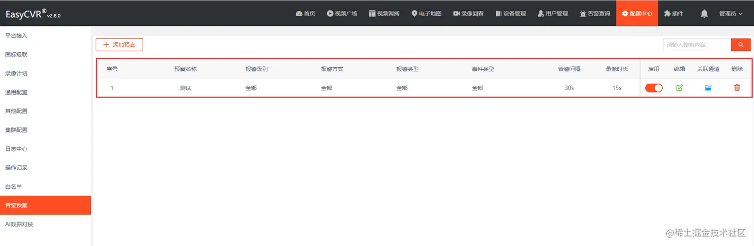 1)在EasyCVR平台设置告警预案,如下: