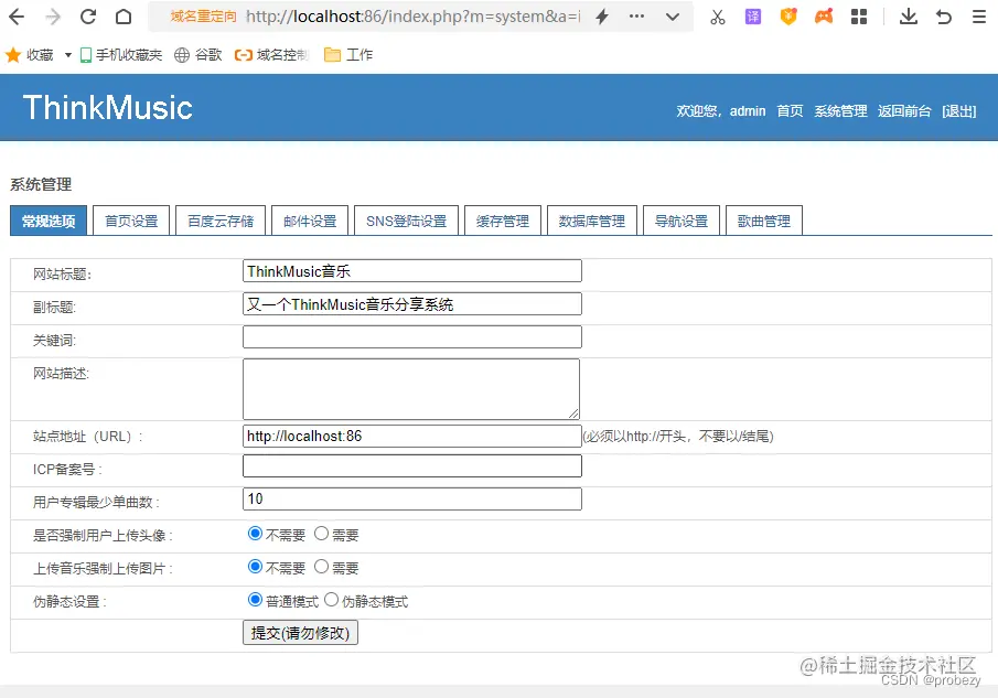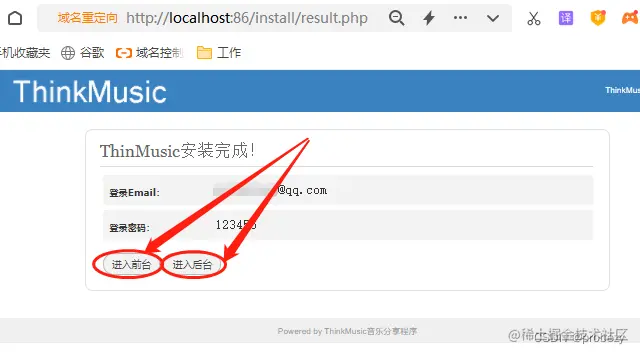完成必要的信息修改和设置后,就可以点击安装页面下方的“提交”,完成ThinkMusic音乐网站的安装。此时网站会提示我们是进入前台或是后台,前台就是访客能够看到的网站,而后台则是我们对该网站进行设置的界面。