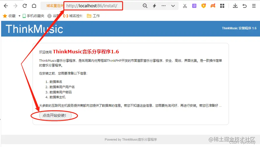 接着我们在浏览器地址栏中输入“localhost:86/install”(之前设置ThinkMusic网站时将输出端口设置在86端口,因此此处输入86.若设置网站输出端口时有不同,则应输入实际端口号)执行网站安装程序,就能进入ThinkMusic音乐网站的安装界面。