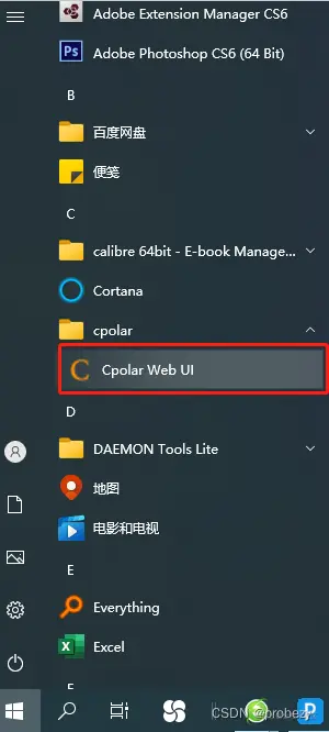 接着我们打开cpolar在本地电脑的客户端(可以在浏览器中输入localhost:9200打开cpolar的Web-UI界面,也可以在开始菜单中找到cpolar的快捷方式)