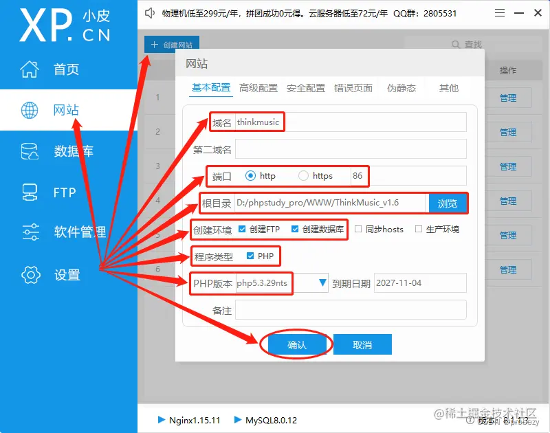 接着我们在PHPStudy的“网站”页面,找到左上角的“创建网站”按钮并点击,设置ThinkMusic音乐网站所需的运行环境,内容包括以下几项