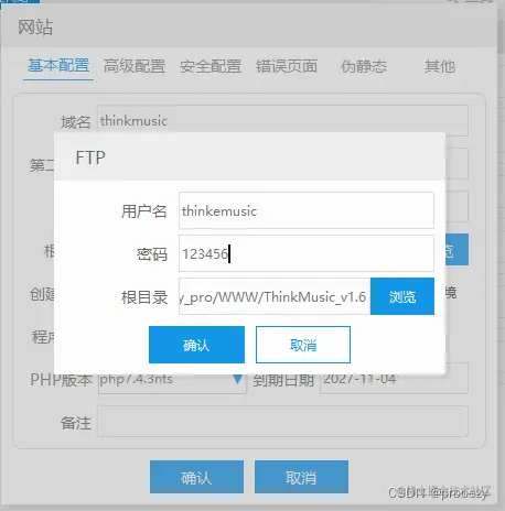 - 根目录 - 即ThinkMusic网站文件存放的路径,如果记不得详细路径的,可以通过栏位右侧的“浏览”按钮选择网站文件存放位置,自动生成路径;