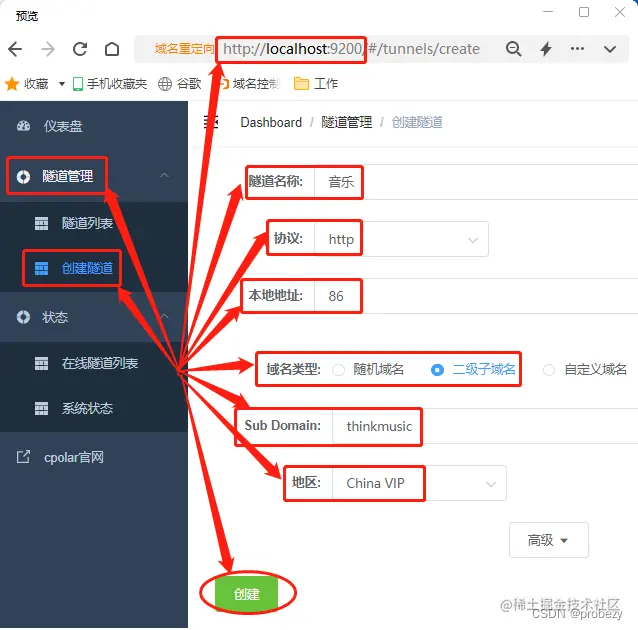 在cpolar本地端,我们选择“隧道管理”项下的“创建隧道”项,进入“创建隧道”页面,在这个页面,我们需要填写几项基本信息用于创建数据隧道,这些信息包括: