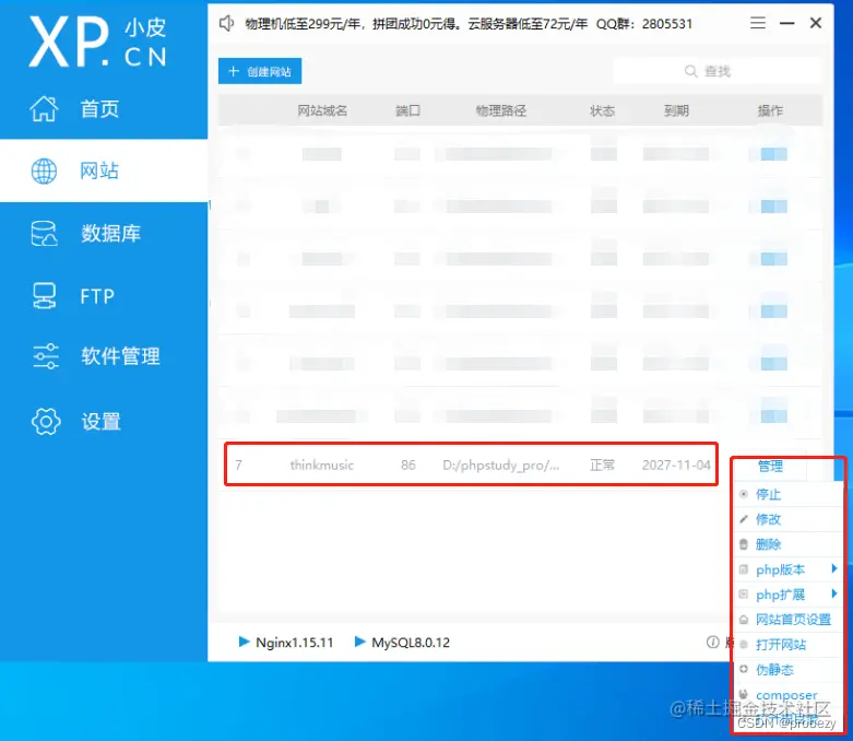 ThinkMusic音乐网站是基于php框架开发,可以提供音乐的上传分享,其运行环境组件包括Nginx、php、MySQL、SQL-Front、FileZilla几项。而PHPStudy也支持这几项软件的直接安装和设置。
