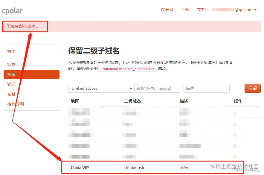 这三项信息填写完毕后,直接点击右侧的“保留”按钮,创建一条固定的二级子域名隧道。
